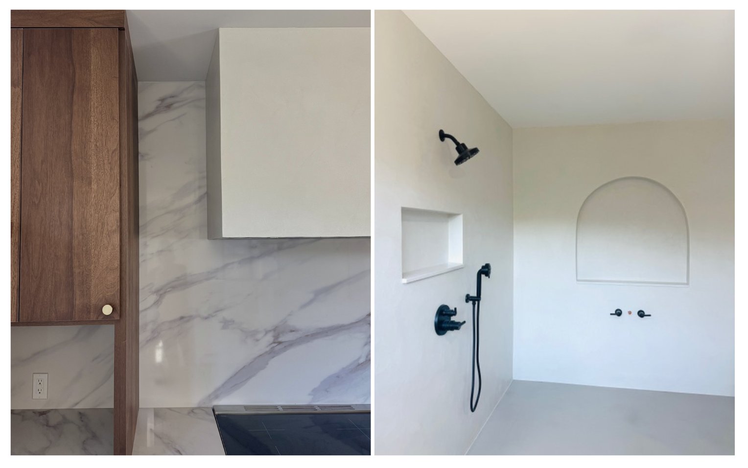 We recently wrapped a project using microcement in the showers, on the fireplace, and on the vent hood, with Roman clay on the walls, and it perfectly captures why these finishes are so loved. There’s something about plaster finishes and troweled materials like Roman clay and microcement that feels both elevated and effortless at the same time. The soft movement, the subtle texture, the way light hits it… it adds depth without demanding attention. It shifts throughout the day, which is what makes it feel so alive.