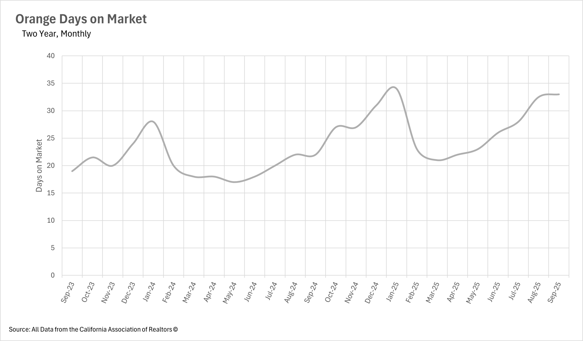 The trend toward dramatically extended selling times has reached its most extreme point yet, fundamentally redefining what constitutes normal market pace. The median single-family home in Orange County now sits on the market for 33 days before selling, representing an extraordinary 50% increase from September 2024's 22 days. This also reflects a slight 1.54% month-over-month increase from August's 32.5-day average, indicating that selling times have essentially plateaued at these elevated levels. This extended timeline has become perhaps the most telling indicator of the current market dynamics, demonstrating that buyers have taken full control of the transaction pace and are leveraging their position to conduct thorough due diligence without competitive pressure. For sellers, this means adjusting expectations to account for timelines that are more than double what they were experiencing just one year ago.
