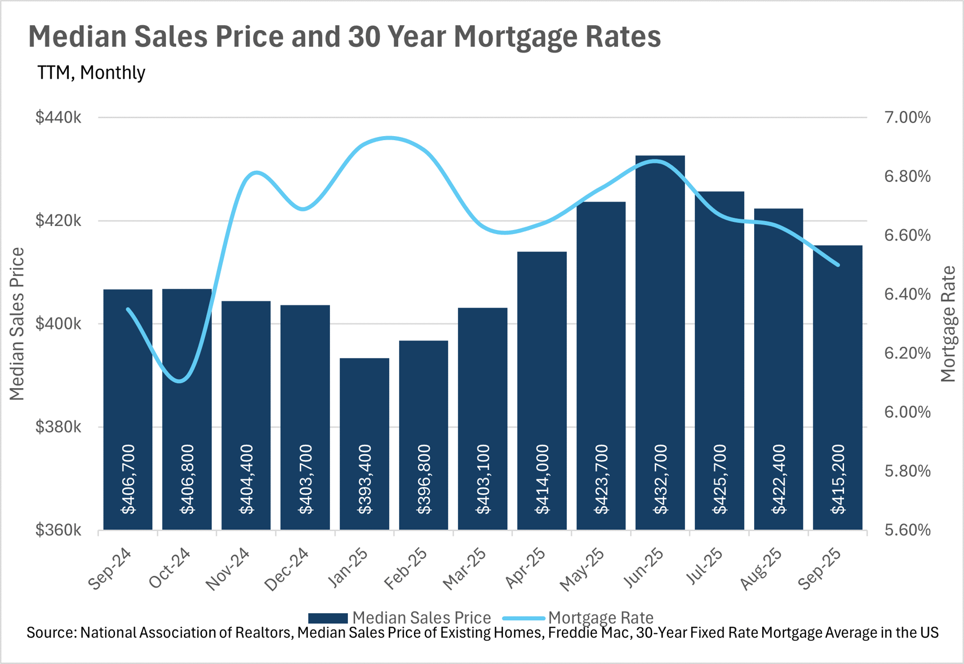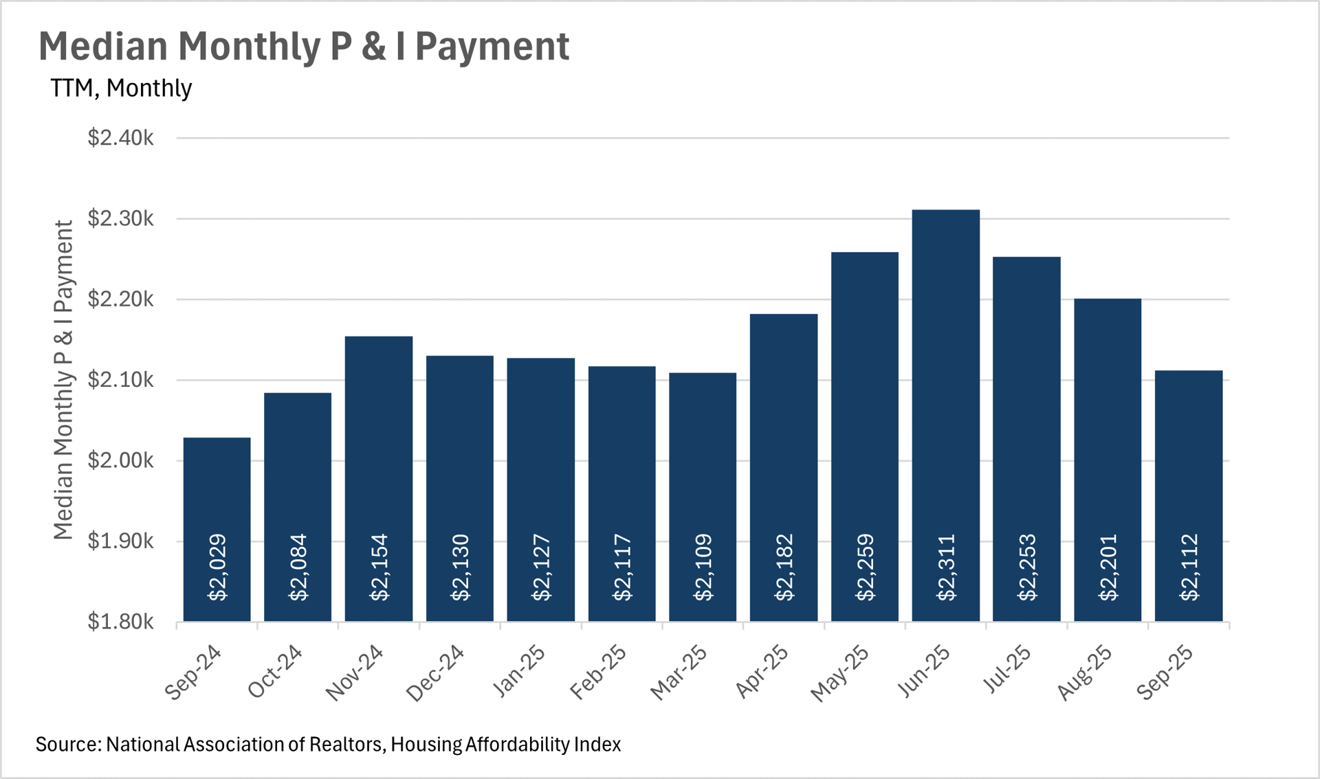 Median monthly P&I payments are on the decline, as one might expect when interest rates are falling. This, of course, is great for new buyers that are in the market for a home. If we see an influx of new buyers, there is the possibility that we might see a less stagnant market when the spring time rush comes in early 2026. Unfortunately though, interest rates are still much too high for many people who locked in rates in the 2-3% range to justify moving to a new home and taking on a considerably higher mortgage payment each month. We likely won’t see these homes/homeowners enter the market until rates come down substantially more than they already have.