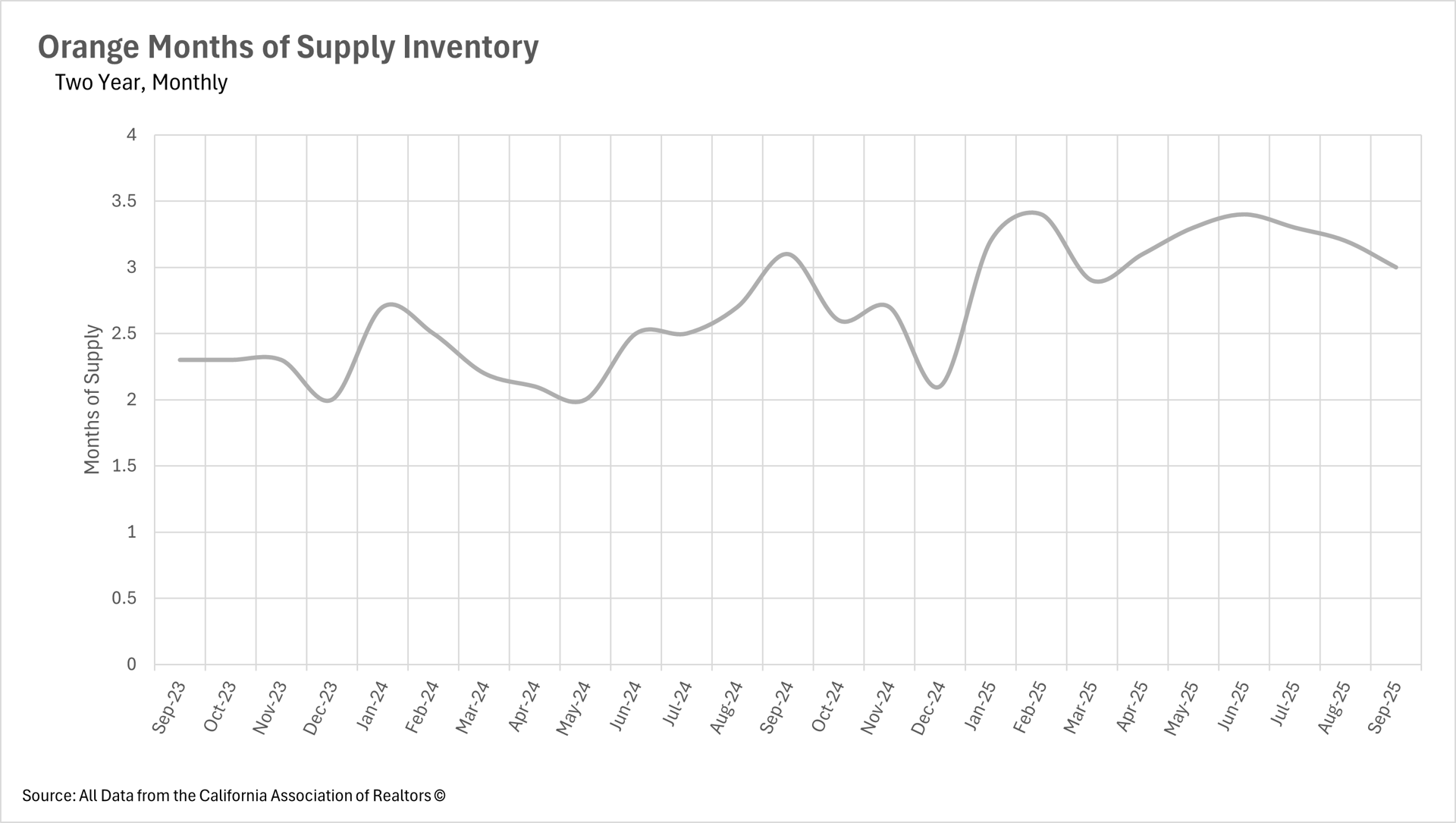 With 3.0 months of supply inventory in September 2025, Orange County has returned to balanced market territory for the first time in several months. This represents a significant 6.25% month-over-month decrease from August's 3.2 months and, remarkably, a 3.23% year-over-year decrease from September 2024's 3.1 months. This shift toward balanced conditions suggests that the market correction has largely run its course, with supply and demand reaching a new equilibrium. While this represents a more neutral environment than the strong buyers' market conditions of earlier in the year, the extended selling times indicate that buyers still maintain meaningful negotiating leverage. Both buyers and sellers should recognize that this balanced state represents neither the seller-dominated conditions of 2024 nor the buyer-dominated conditions of summer 2025, requiring both parties to approach negotiations with realistic expectations.