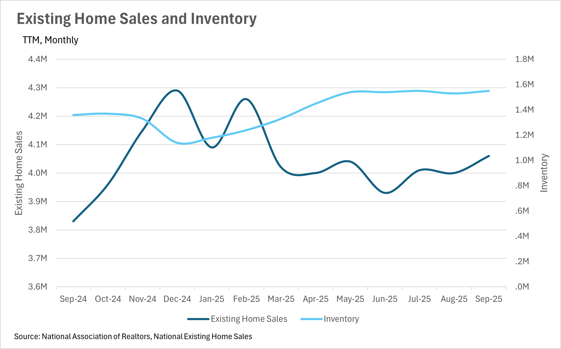 Inventories have remained incredibly strong throughout this year, as inventory growth has consistently outstripped existing home sale growth. This past month, we saw inventories grow by 13.97% on a year-over-year basis, while there were only 6.01% more existing homes sold. It’ll be interesting to see where inventories go over the course of the winter, since they usually decline meaningfully.
