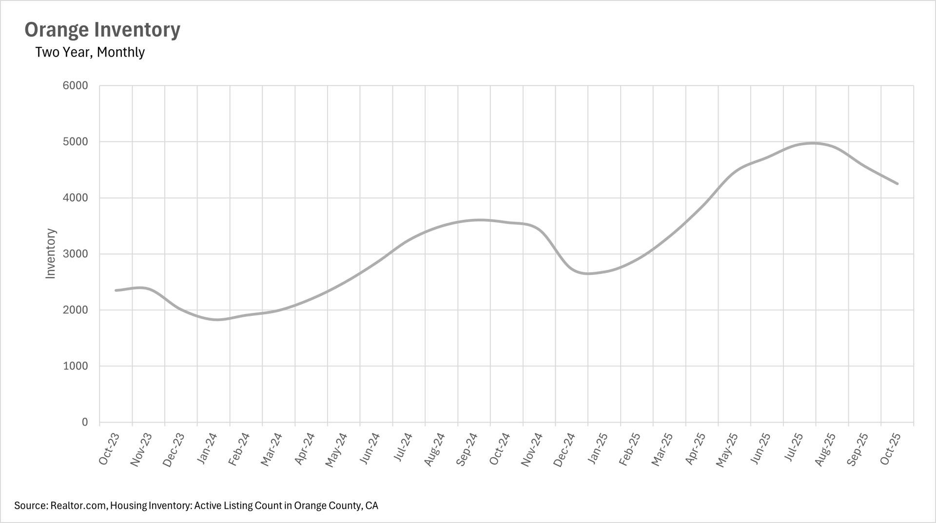 Orange County's housing inventory continues its seasonal normalization pattern as we move deeper into fall. The latest data for October 2025 shows 4,251 single-family homes on the market, representing a 6.80% month-over-month decline from September's 4,561 homes. This marks the third consecutive month of declining inventory levels, demonstrating that typical seasonal patterns have reasserted themselves after the extraordinary spring and summer buildup. However, the market still maintains a 19.31% year-over-year increase compared to October 2024's 3,563 homes, meaning buyers continue to enjoy significantly more options than they had last year. While the inventory trajectory is clearly downward from summer peaks, the market remains well-supplied with nearly 700 more homes available than this time last year.