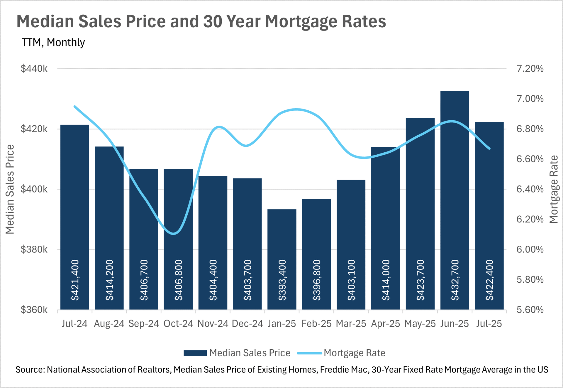 • Median sale prices maintain modest positive growth with a 0.72% year-over-year increase in July 2025, though prices declined significantly from June's peak.